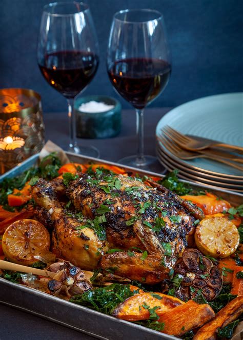 Helgrillad kyckling passar utmärkt med potatisgratäng, sallad, grönsaker och sås.
